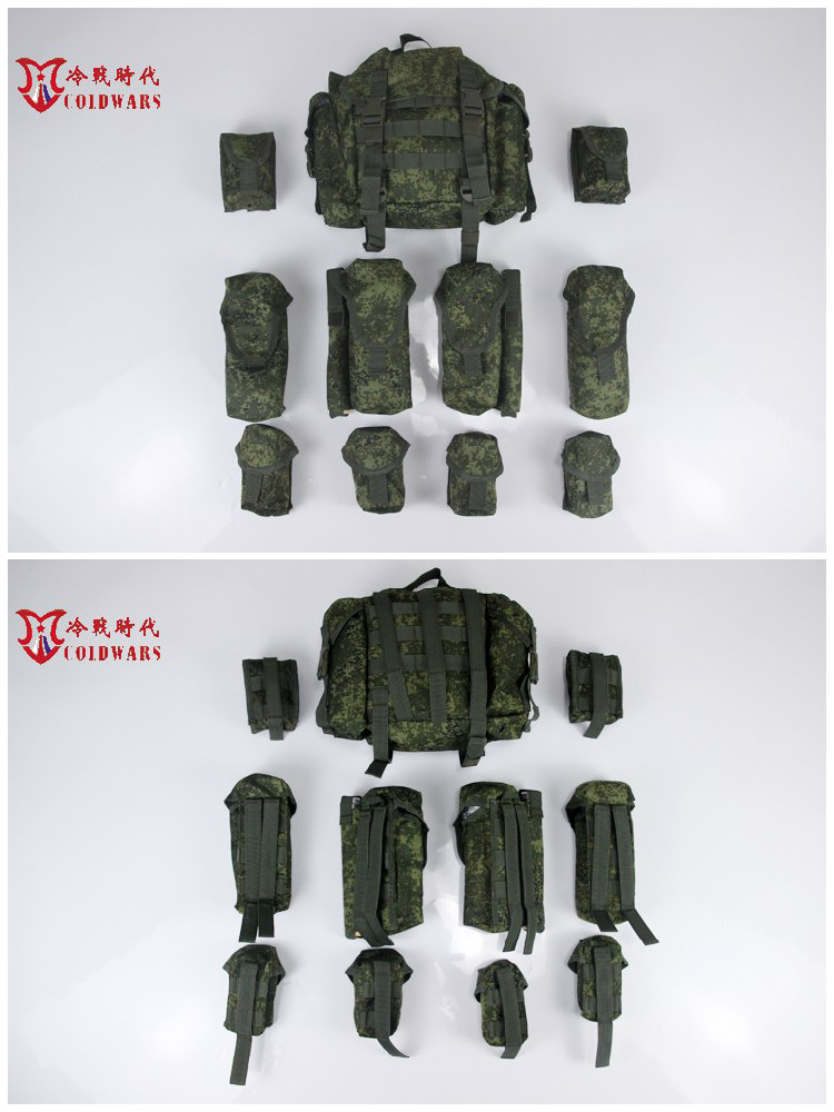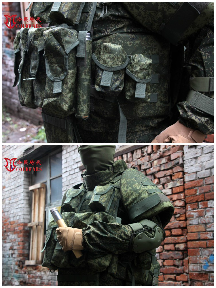 In addition to wearing shoulder and groin bulletproof armor, the model is wearing an EMR camo KMX shirt, a replica version of the 6B47 helmet, eagle eye goggles with EMR camo camouflage hood, a green face mask, and a replica version of the 6B51 protective gear. The model is also wearing black Russian-style full leather tactical boots, and has a contemporary green man appearance.